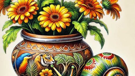 Yellow flowers filled the stoneware pot before me, their vibrant petals standing out against the backdrop of a truly unique piece of pottery. The pot was adorned with a delicate silver ring tracing the rim, adding a touch of elegance to its handcrafted design. Encircling the pot were intricately carved jungle animals, each one meticulously