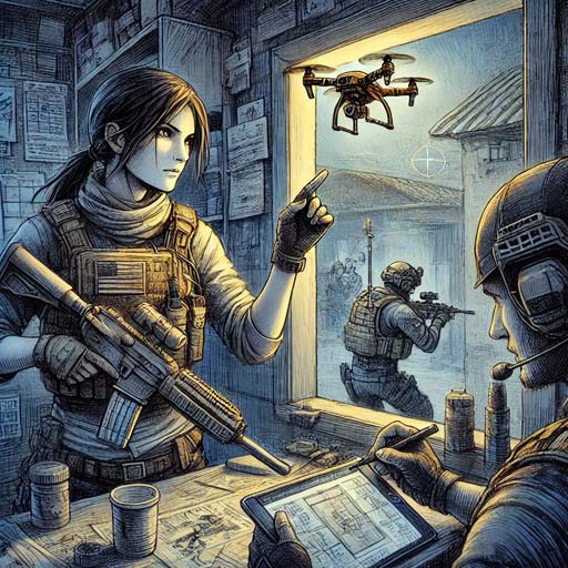 Inside the dimly lit building, Ryan quickly set up a device—a small mechanical drone he had built for reconnaissance. “This should buy us time,” he whispered, sending the drone out through the window. The tiny device buzzed quietly as it moved through the alleyways, its image feed beaming back to Ryan’s wrist device.
