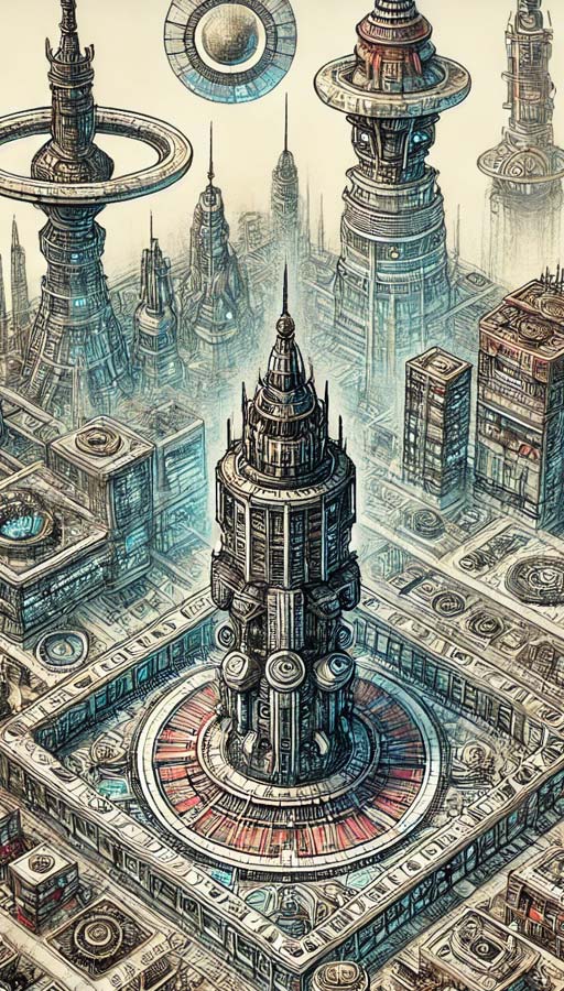 Moments later, they emerged at a portal station on the outskirts of something long forgotten—the edge of an empty Soomite city. Towers of sleek, angular design loomed in the distance, their surfaces etched with faintly glowing symbols. Rusted machines lay scattered along the deserted streets, a graveyard of ancient technology that had long ceased to function. The air was thick with silence, interrupted only by the distant hum of machinery that still clung to life.
