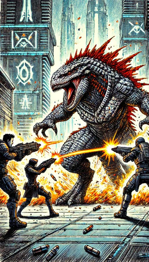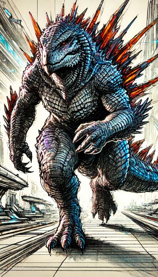 It moved slowly, but every step sent vibrations through the ground. Towering above the ruins, the creature resembled something from a nightmare—its silhouette akin to that of a hulking reptilian beast, its jagged back lined with massive spines that glowed faintly in the pale light. Its skin, dark and scaled, shimmered with an unnatural sheen, and its long, muscular tail waivered above the ground. The head was monstrous, with glowing, predatory eyes that seemed to lock onto the team from across the expanse.